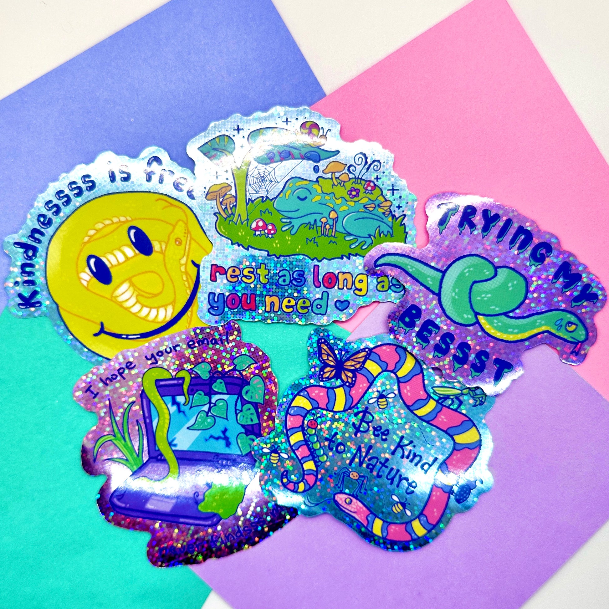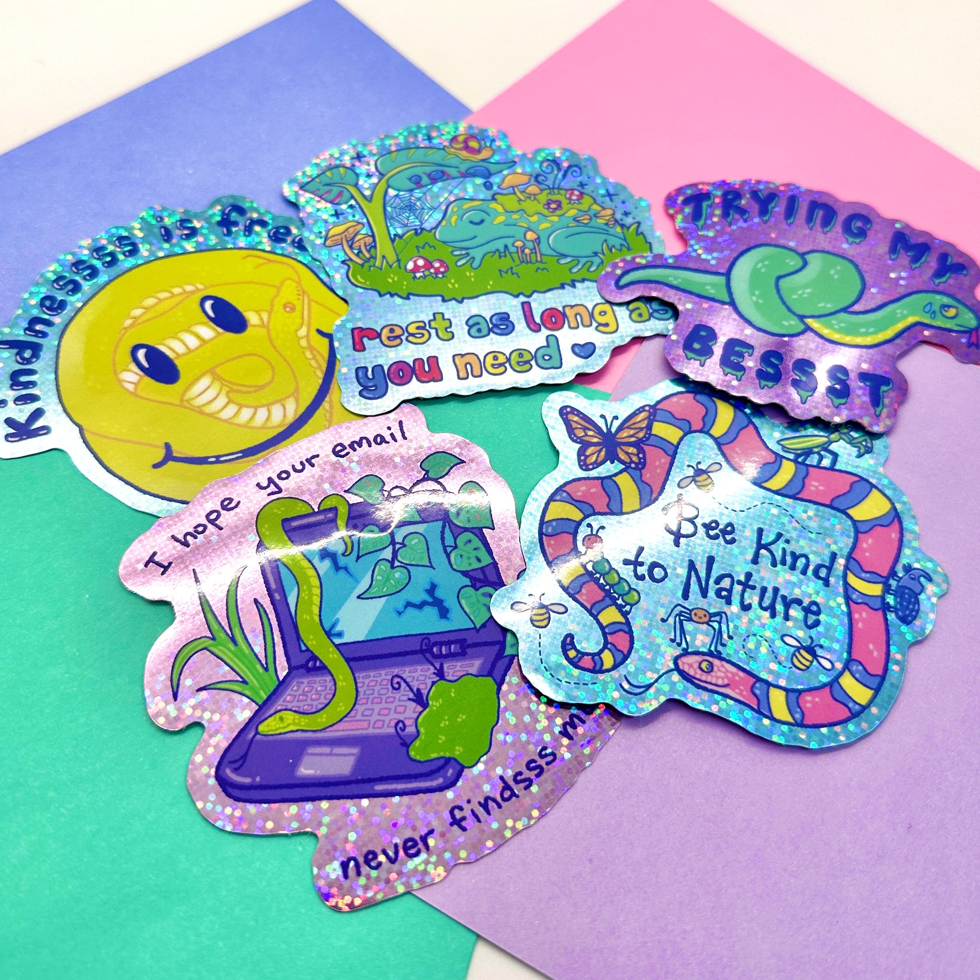 What’s better than one glitter sticker? A whole bunch of them! These stickers are 3" (7.6 cm) wide and made of durable glossy glitter vinyl that's waterproof and UV proof. Brought to you by Max, an anonymous benefactor of the arts :)