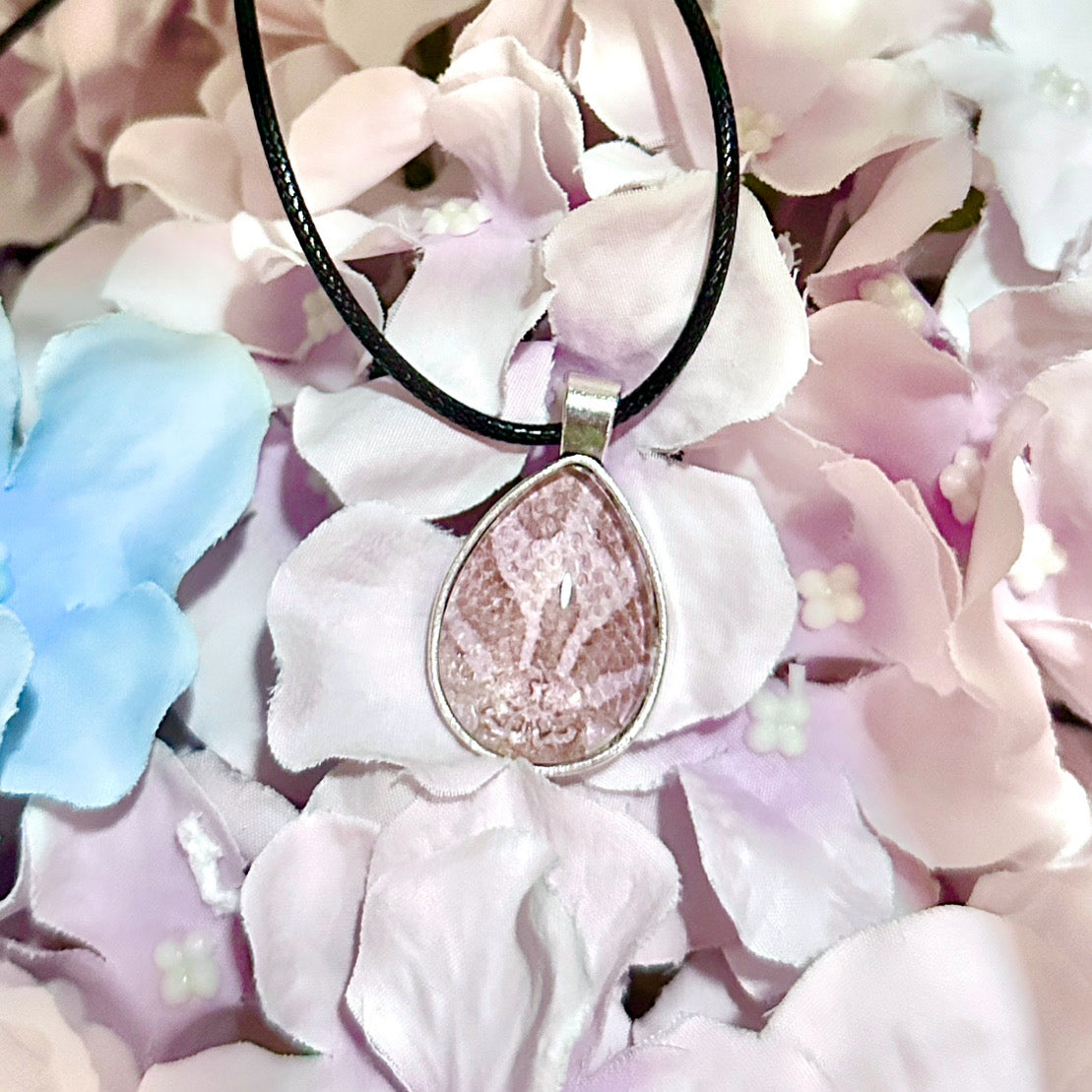 All pendants come with a black cord, have a 9"/23cm length and are metal with a glass gem covering the shed. They are not waterproof or water resistant, so I strongly recommend removing them before showering, swimming, or other water activities. If your pendant gets dirty, you can gently surface clean it with an alcohol wipe.