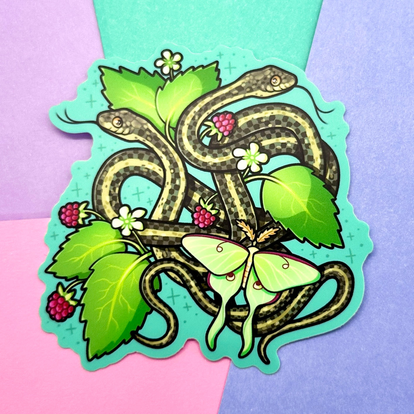 Take a hike through the forest with these cute garters and their Luna moth friend! These stickers are 3" (7.6 cm) wide and made of durable matte vinyl that's waterproof and UV proof.