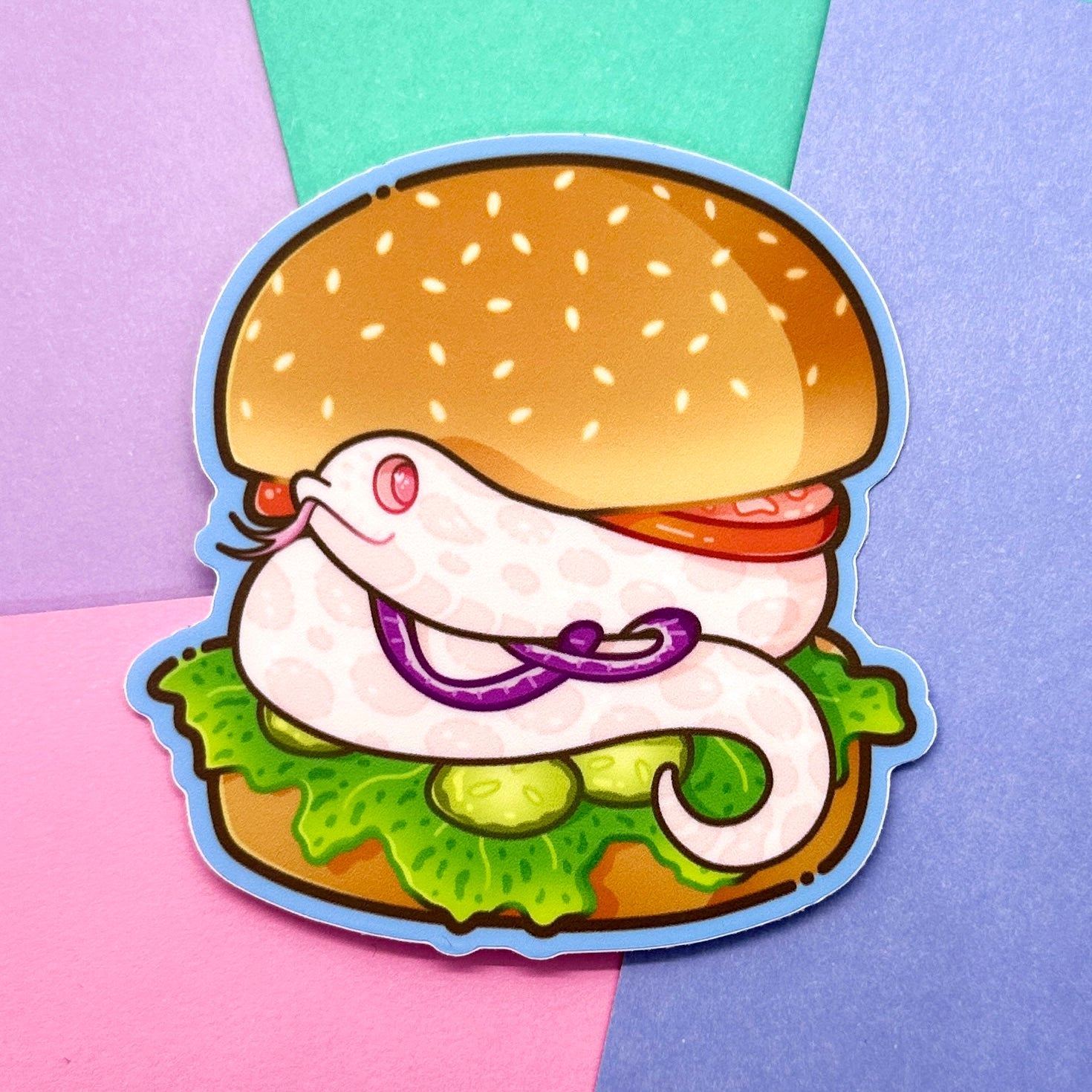 Order up, one hot fresh snurger (snake burger)! Don’t worry, he’s just for decoration 😂 Stickers are perfect for decorating your laptop, sketchbook, water bottle, tablet, phone case, car bumper, and anything else you want – the sky's the limit! These stickers are 3" (7.6 cm) wide and made of durable matte vinyl that's waterproof and UV proof.