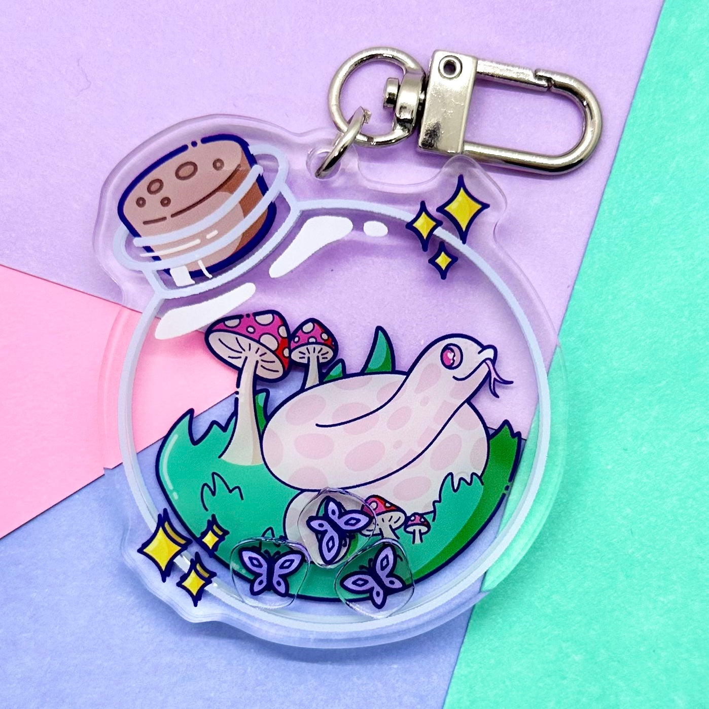 A magical little terrarium to bring on your adventures! Keychains are the perfect fun accessory for bags, purses, backpacks, lanyards, keyrings, and more. These keychains are 2.5” with a metal clasp, and they are made of clear acrylic with mini butterflies that shake around inside.