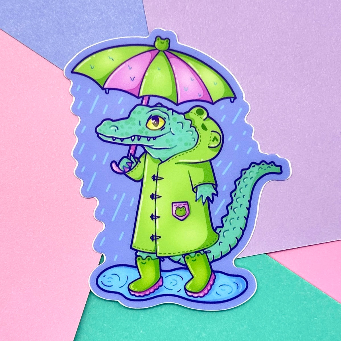 This gator friend is all dressed up and ready for a rainy day! These stickers are 3" (7.6 cm) wide and made of durable matte vinyl that's waterproof and UV proof. Stickers are perfect for decorating your laptop, sketchbook, water bottle, tablet, phone case, car bumper, and anything else you want – the sky's the limit!