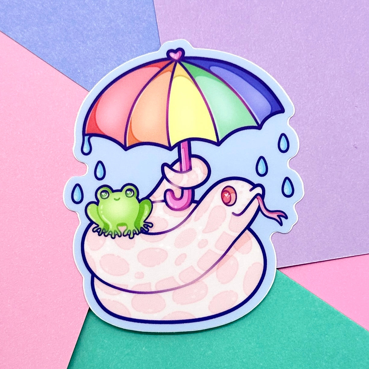 A sssweet friend to keep you company on rainy days! Stickers are perfect for decorating your laptop, sketchbook, water bottle, tablet, phone case, car bumper, and anything else you want – the sky's the limit! These stickers are 3" (7.6 cm) wide and made of durable matte vinyl that's waterproof and UV proof.